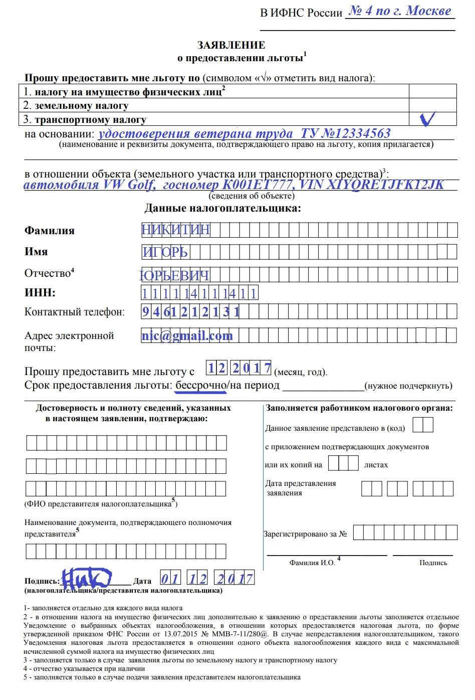 Заявление на предоставление льготы