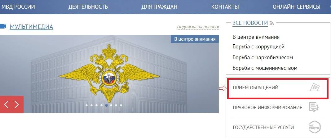 На сайте МВД (мвд.рф) кликаем в правой колонке по опции «Прием обращений»: