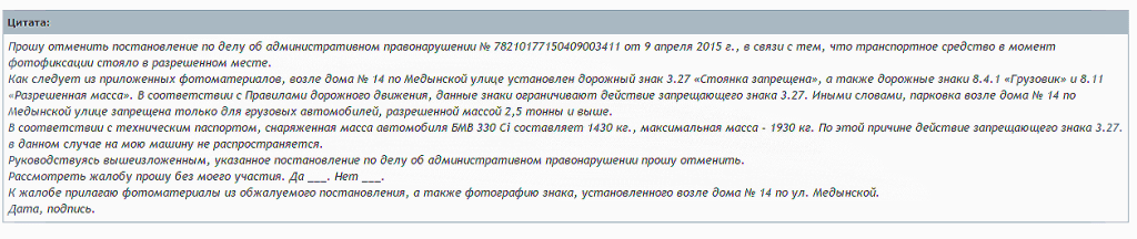 - перечень приложений (копия постановления, фотоматериалы с камеры, документы, подтверждающие правоту заявителя);