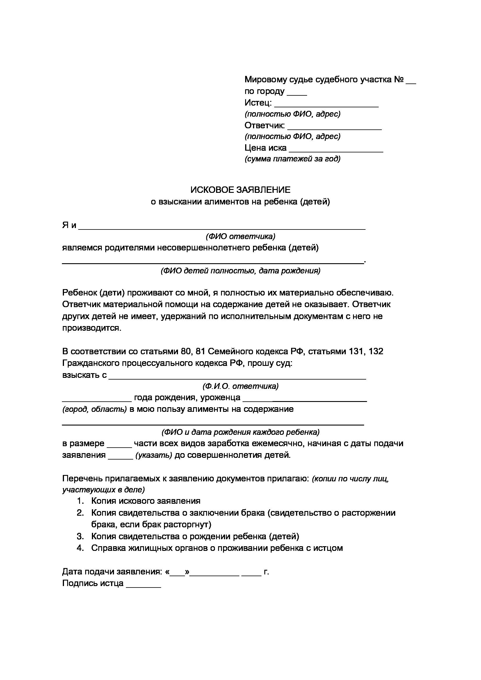 - Исковое заявление на взыскание алиментов.