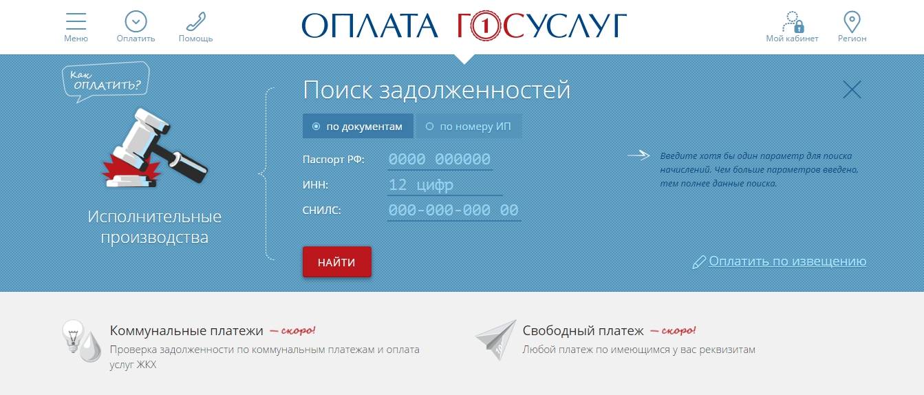 После поиска счетов также будет представлена форма для оплаты найденных задолженностей.