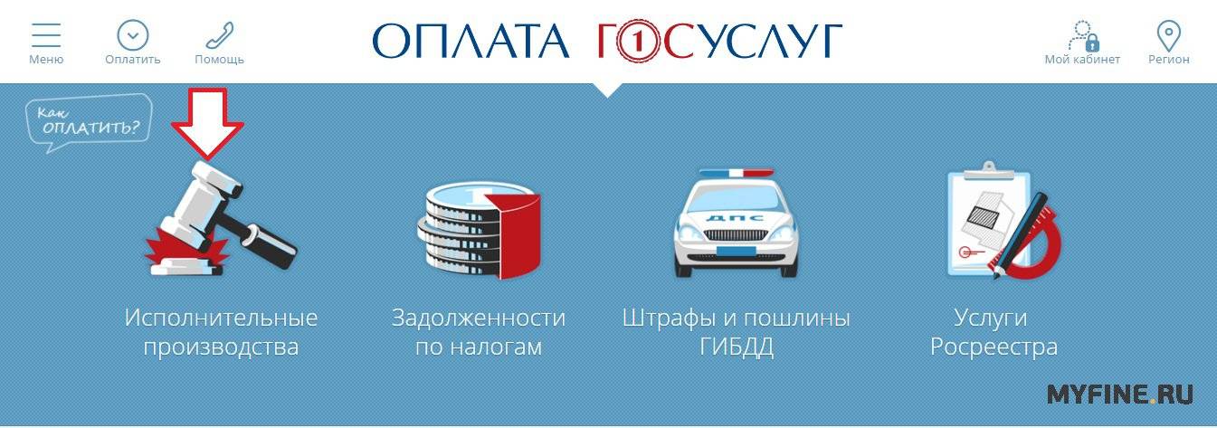 Найти задолженности по просроченным штрафам можно также по номеру паспорта, ИНН или СНИЛС на сайте оплатагосуслуг.ру. Для этого зайдите на главную страницу сайта и выберите «Исполнительные производства».