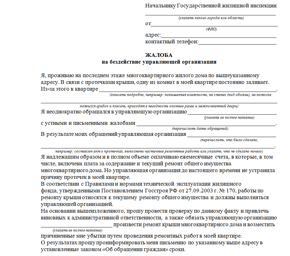 Жалоба в жилищную инспекцию на бездействие управляющей компании