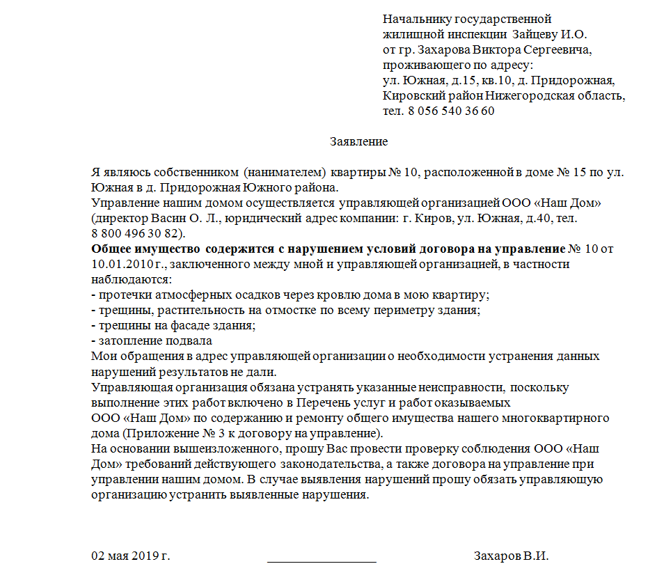 Жалоба в жилищную инспекцию на управляющую компанию: образец