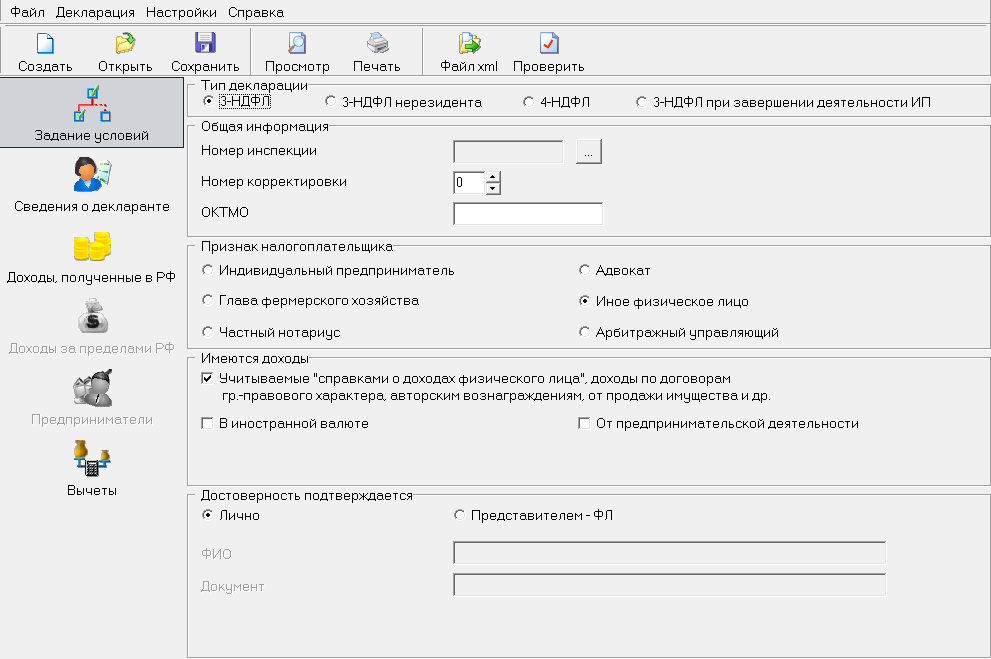На первой вкладке задаются основные условия подачи декларации: