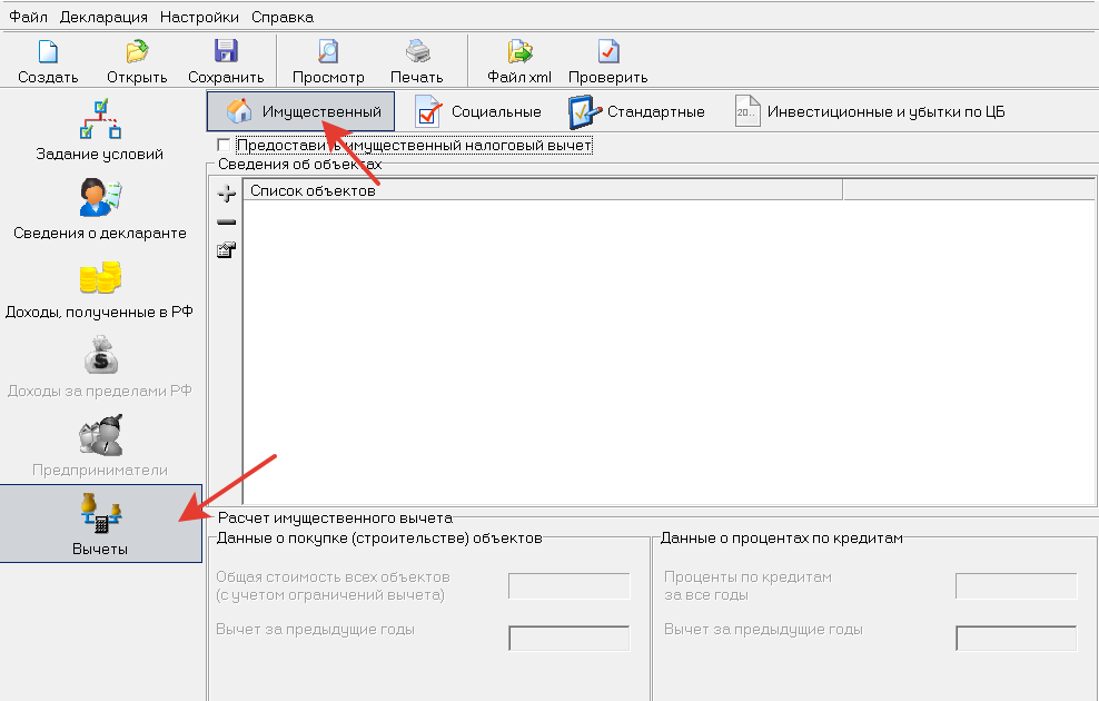 В последнем разделе «вычеты» заполняется информация о приобретенных объектах, в отношении которых пенсионер желает возместить НДФЛ.