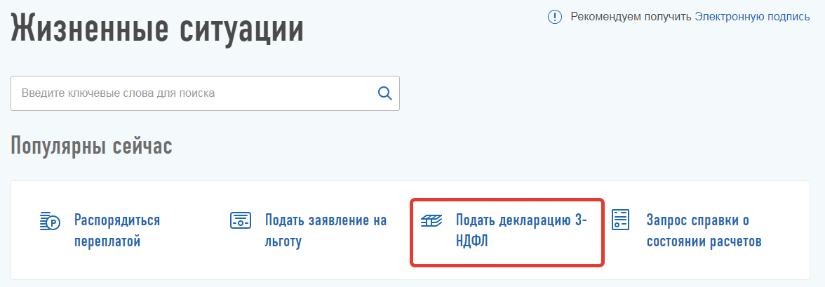 После заполнения всех граф следует сохранить документ. Далее войти в личный кабинет на сайте налоговой, и перейти в раздел «Жизненные ситуации». Среди популярных услуг выбрать «Подать декларацию 3-НДФЛ».
