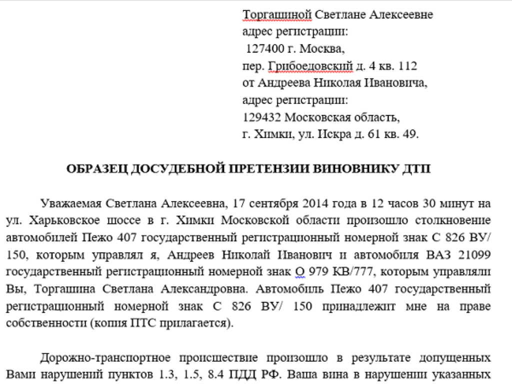 Претензия виновнику ДТП.