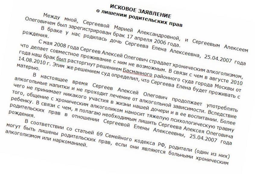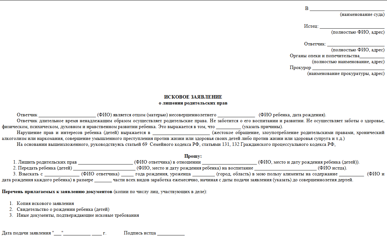 Следующим этапом является составление искового заявления о лишении прав. Типовая форма выглядит следующим образом: