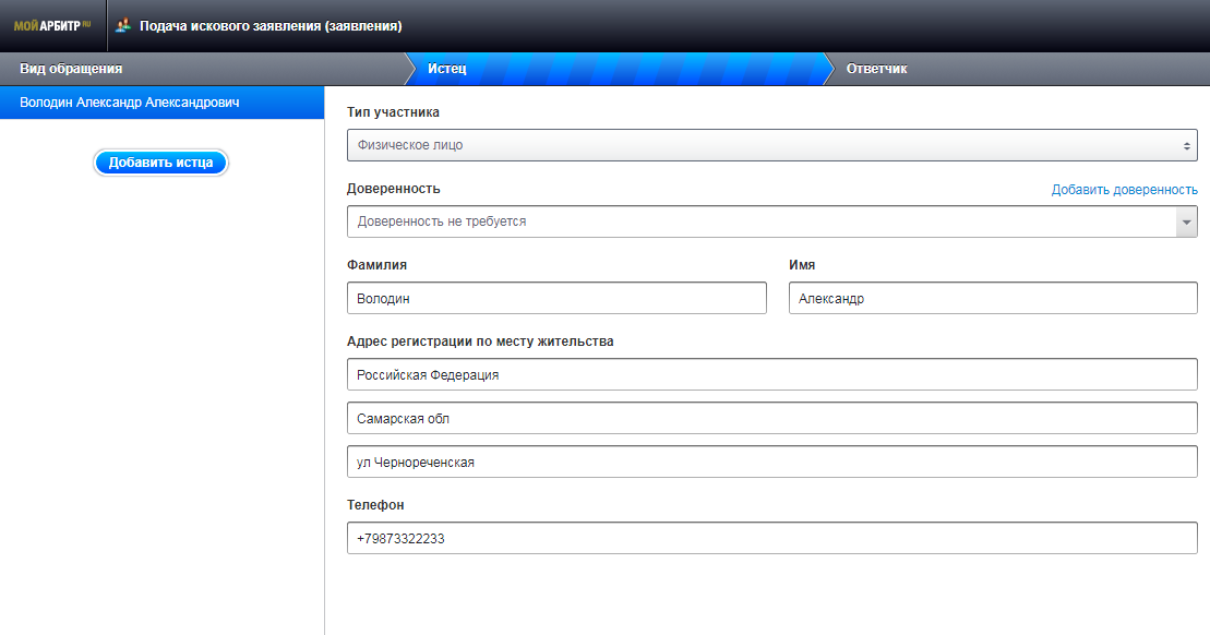 Теперь от вас потребуется ввести все необходимые данные истца или же истцов, если их несколько
