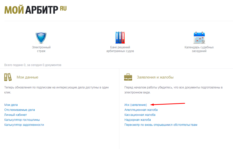 Можно воспользоваться государственным сайтом my.arbitr, где потребуется найти услуги «Мой арбитраж», а затем раздел с названием «Заявления и жалобы». Здесь необходимо выбрать из предложенных подходящий вид заявления: иск, апелляционная, кассационная или надзорная жалоба, заявление с просьбой о пересмотре дела по причине возникновения вновь открывшихся обстоятельств.