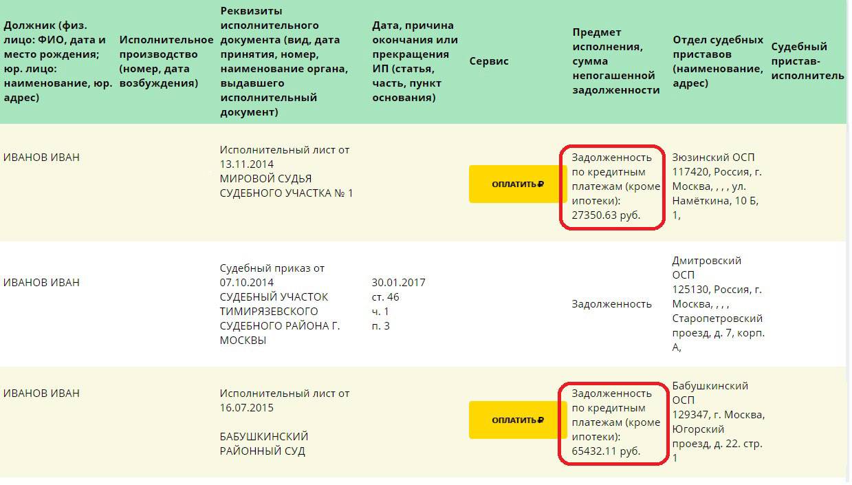 Если задолженность есть, выше появится табличка со всеми исполнительными производствами (ИП), открытыми на данного человека