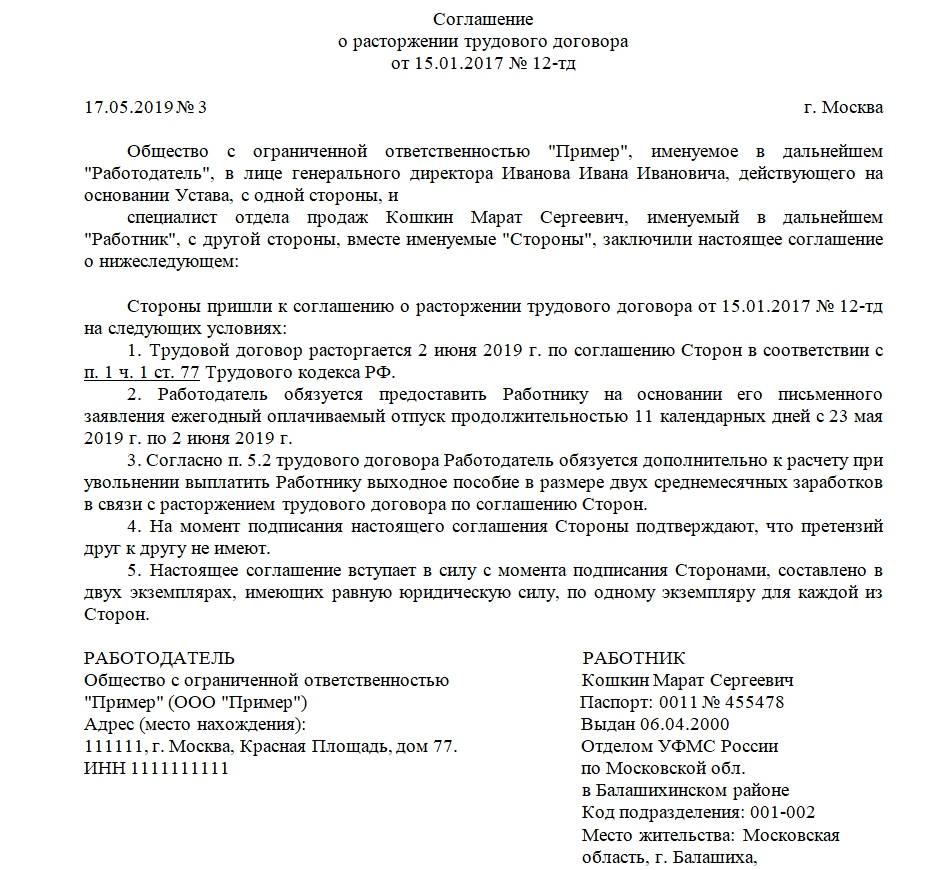 Ознакомьтесь на примере, как выглядит образец соглашения сторон при увольнении.