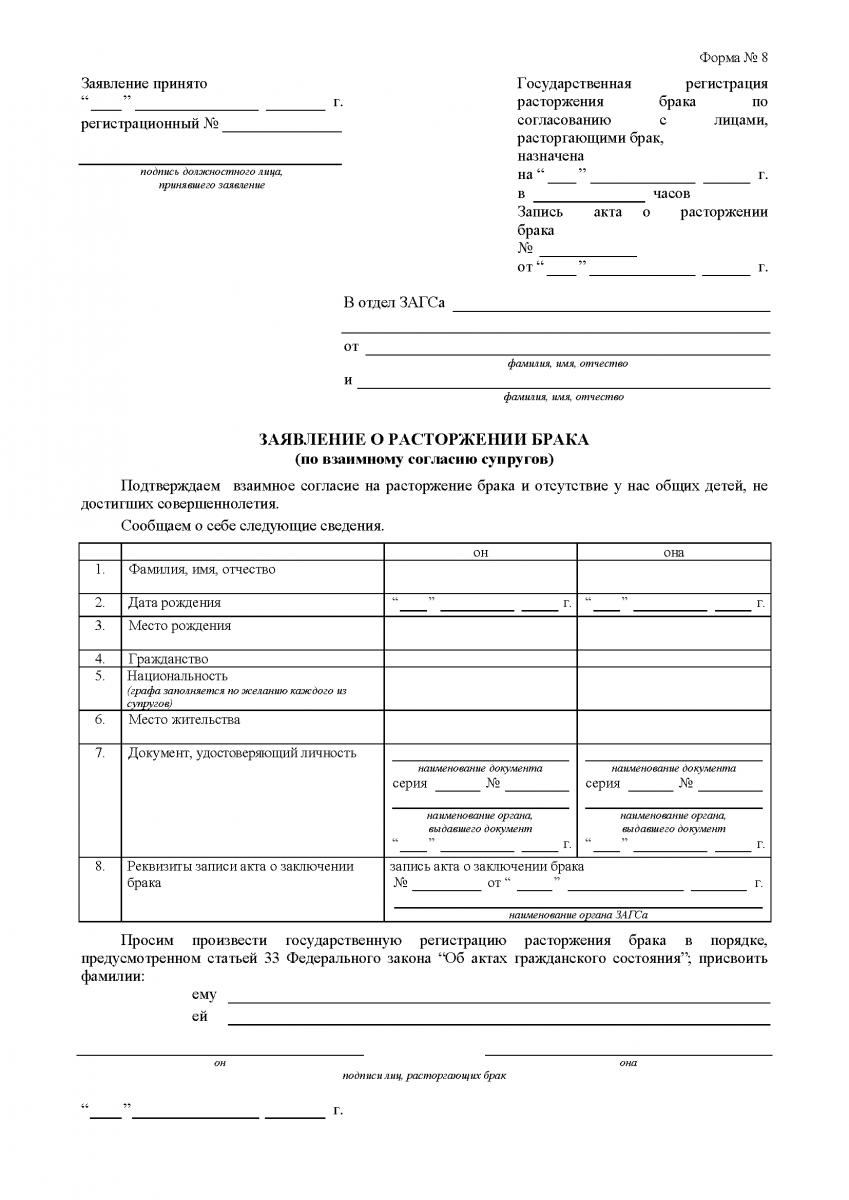 - Форма № 8 — понадобится в том случае, когда пара приняла обоюдное решение. Бланк заполняется совместно, так как в нём должна содержаться информация о муже и жене.