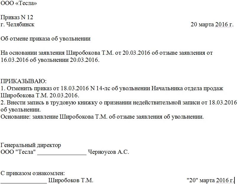 Образец заполнения на примере отмены приказа об увольнении