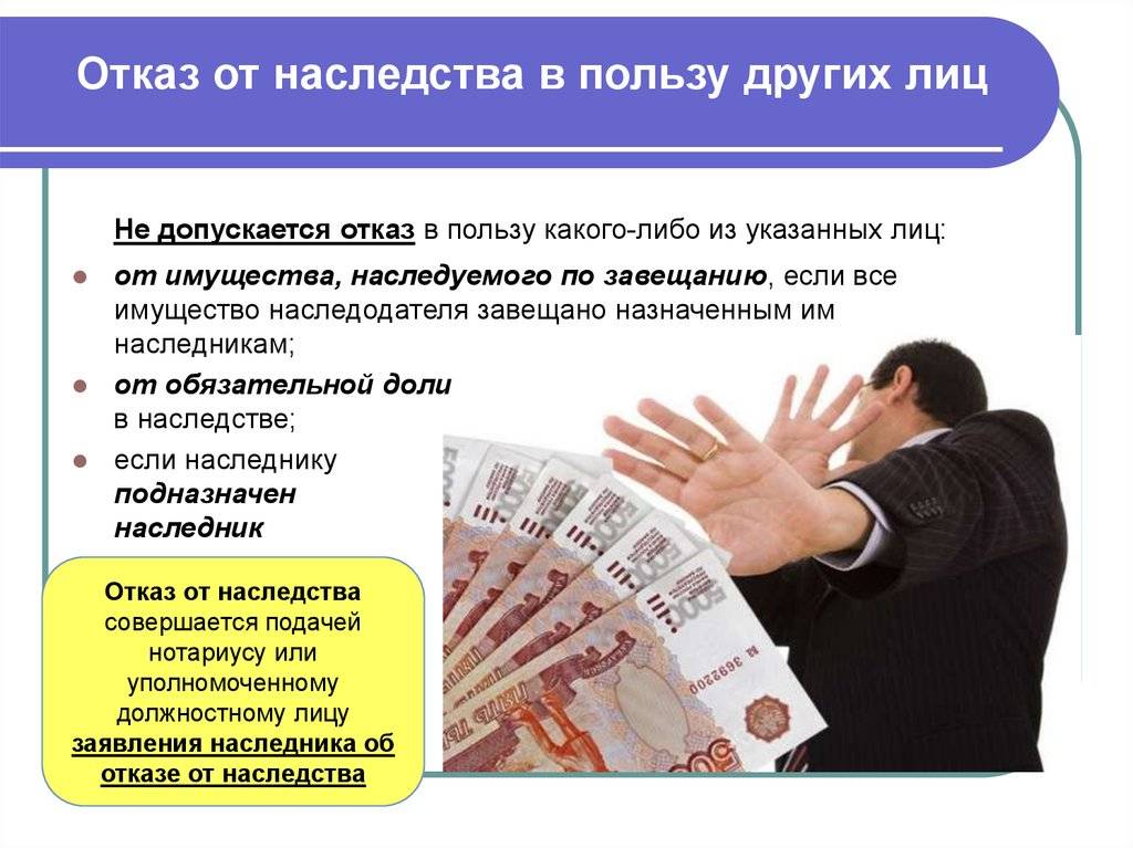Отказаться можно в пользу иных граждан. Недопустимо это делать в таких случаях: