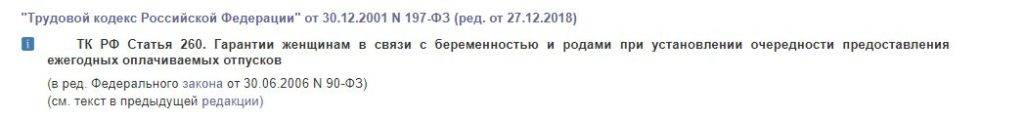 - Ссылка на статью 260 Трудового кодекса РФ.