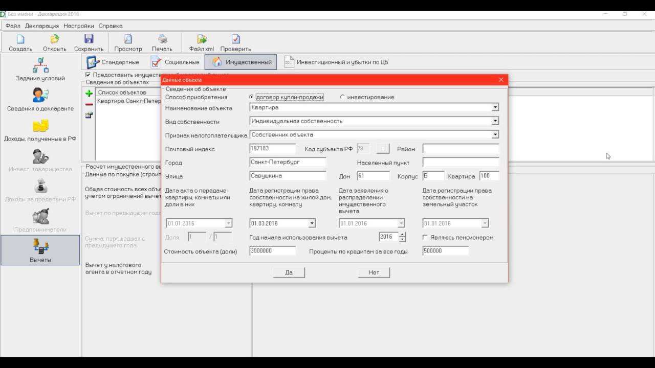 После этого необходимо открыть вкладку с названием «Вычеты». На панели сверху нужно выбрать необходимый тип, то есть имущественный. Затем надо ввести информацию об объекте недвижимости: