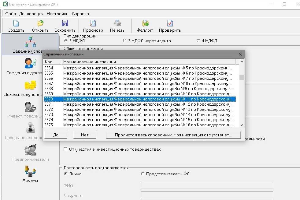 После загрузки программы на свой личный компьютер нужно ее запустить, а затем открыть вкладку «Задание условий». Здесь потребуется указать номер налогового органа по месту регистрации физического лица, куда будут отправлены документы на получение вычета.