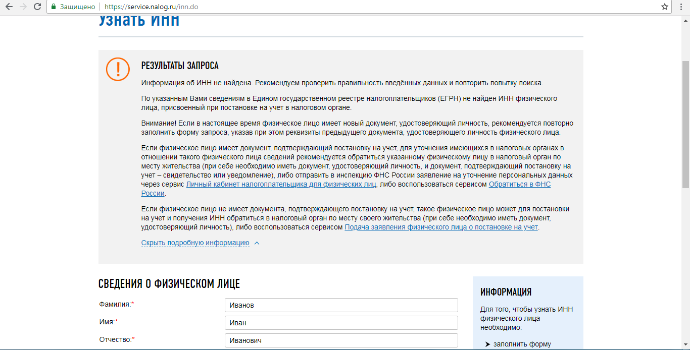 В случае отсутствия ИНН у лица, данные которого внесены в форму, система предложит проверить сведения и повторить запрос.