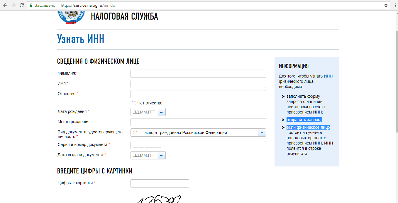 Кликнув на нее, на экране можно увидеть специальную форму, в строках которой нужно обязательно указать ФИО пользователя, дату и место рождения, а также ввести паспортные данные. После этого кликнуть на кнопку «Отправить запрос». Если все введено верно, то информация об ИНН появится через несколько секунд на экране.