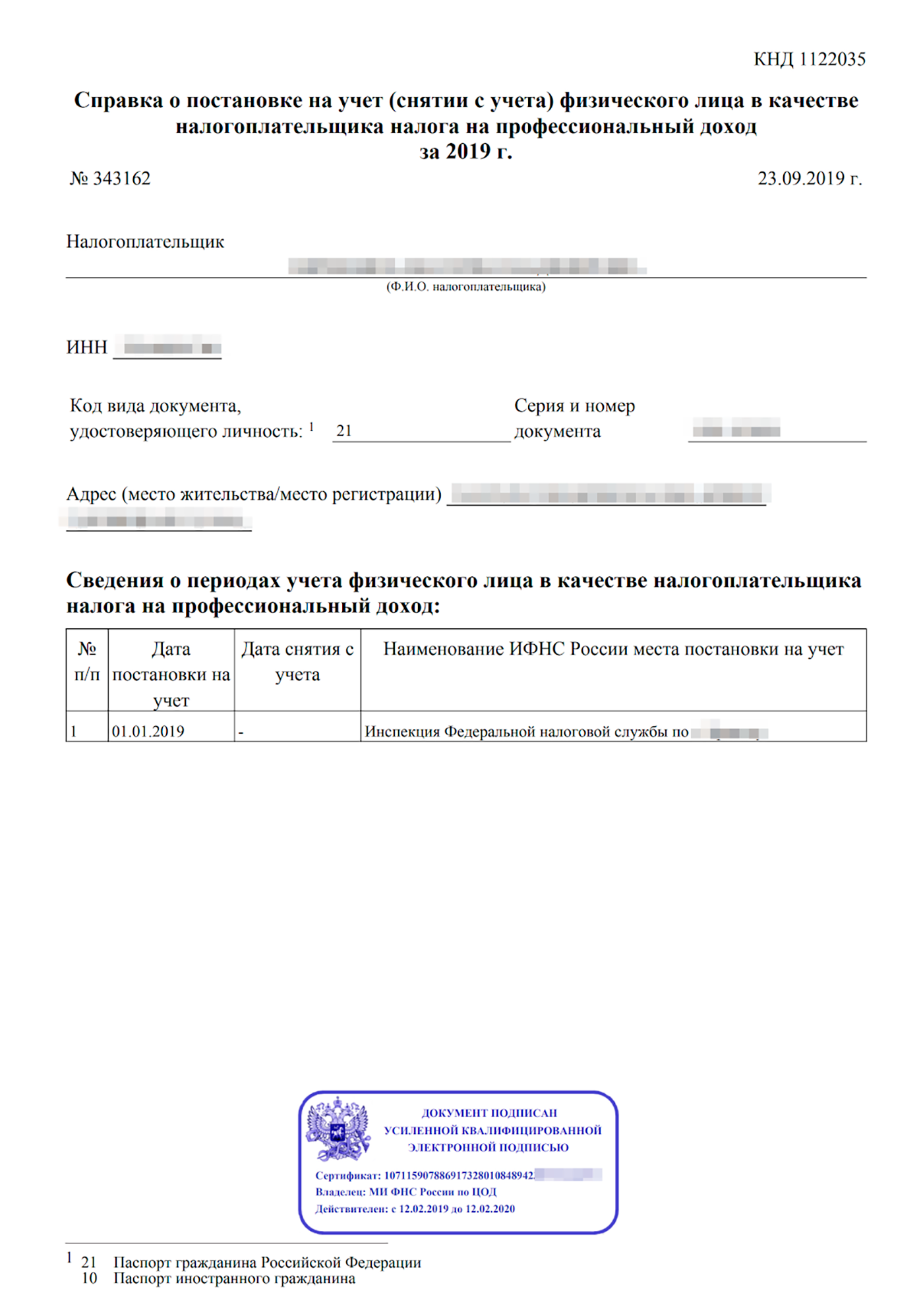 Справка подтверждает, что физлицо применяет НПД и отчитывается перед налоговой о своих доходах