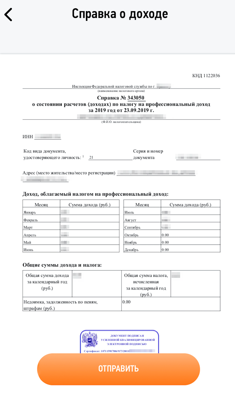 — Есть справка из налоговой, она с электронной подписью ФНС. Сформирую прямо сейчас в приложении «Мой налог» и отправлю, куда скажете.