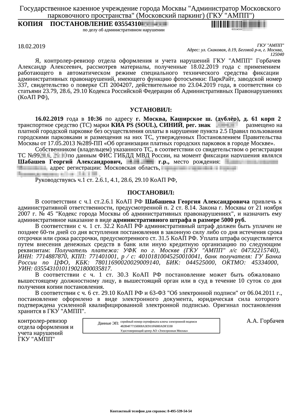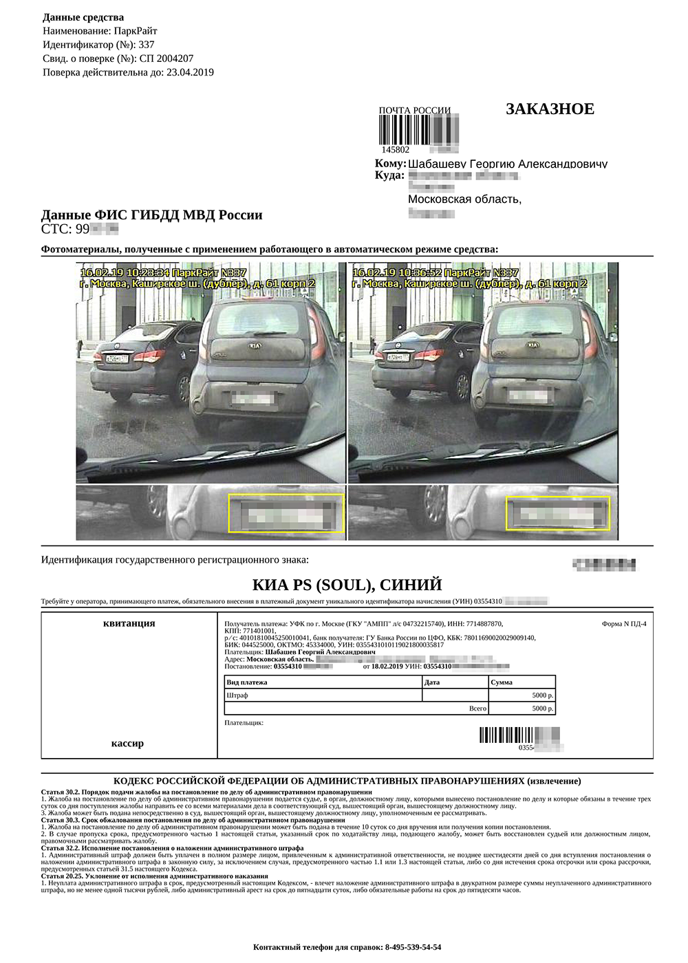 В постановлении указывается характер нарушения, время и адрес, по которому его зафиксировали, и фотографии автомобиля с крупно выделенным номером. Если оштрафовали за неоплаченную парковку, в постановлении будет две фотографии с интервалом съемки не менее 5 минут — столько отводится на оплату парковки после остановки автомобиля.
