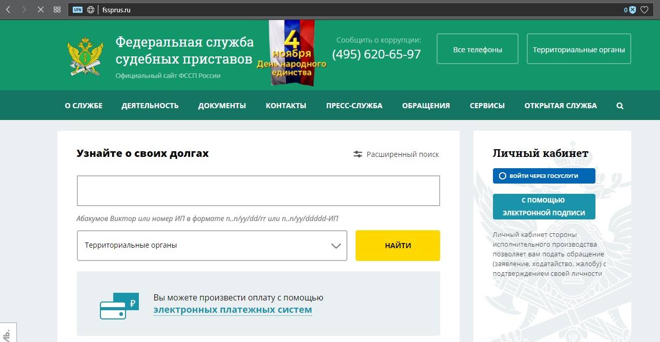 Страница сайта ФССП.
