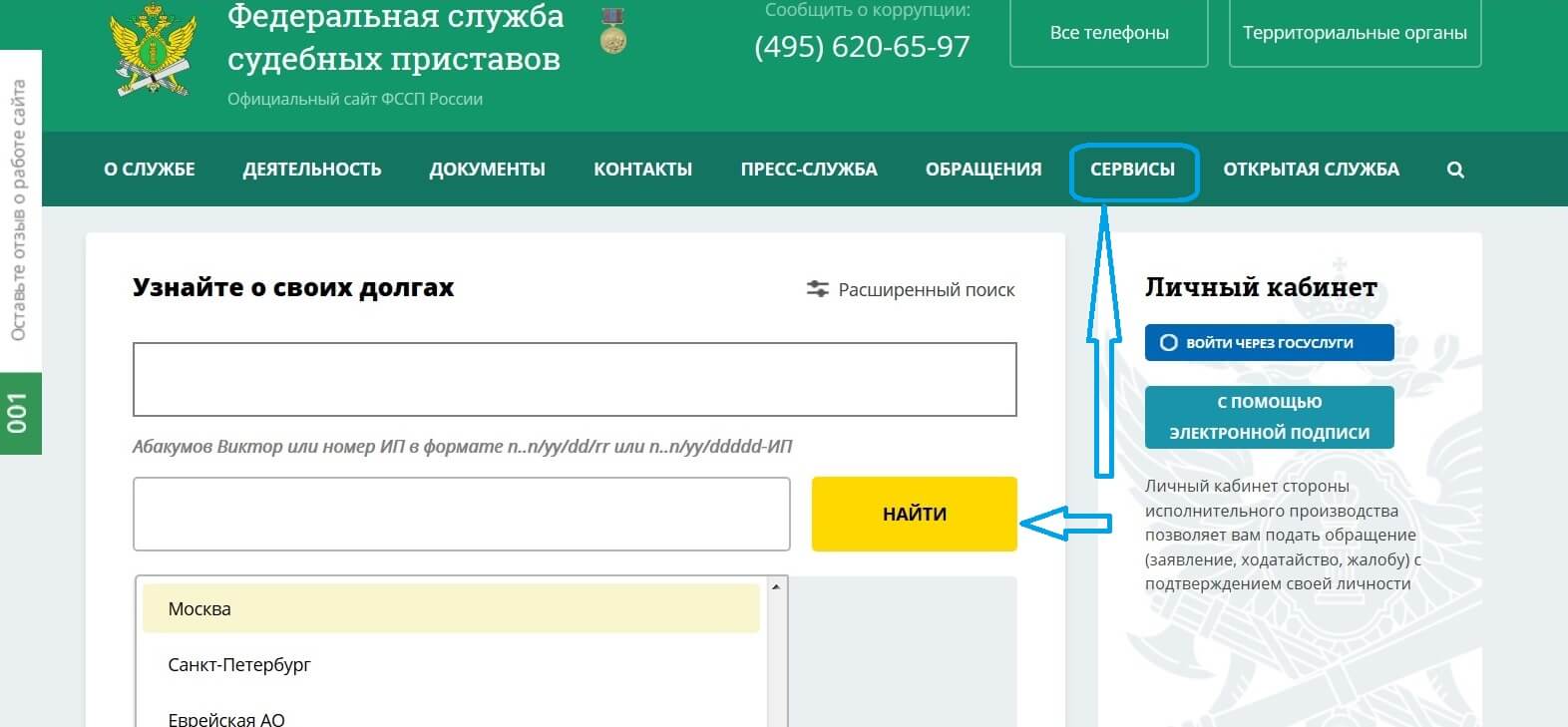 задолженность с помощью соответствующего сервиса на сайте ФССП