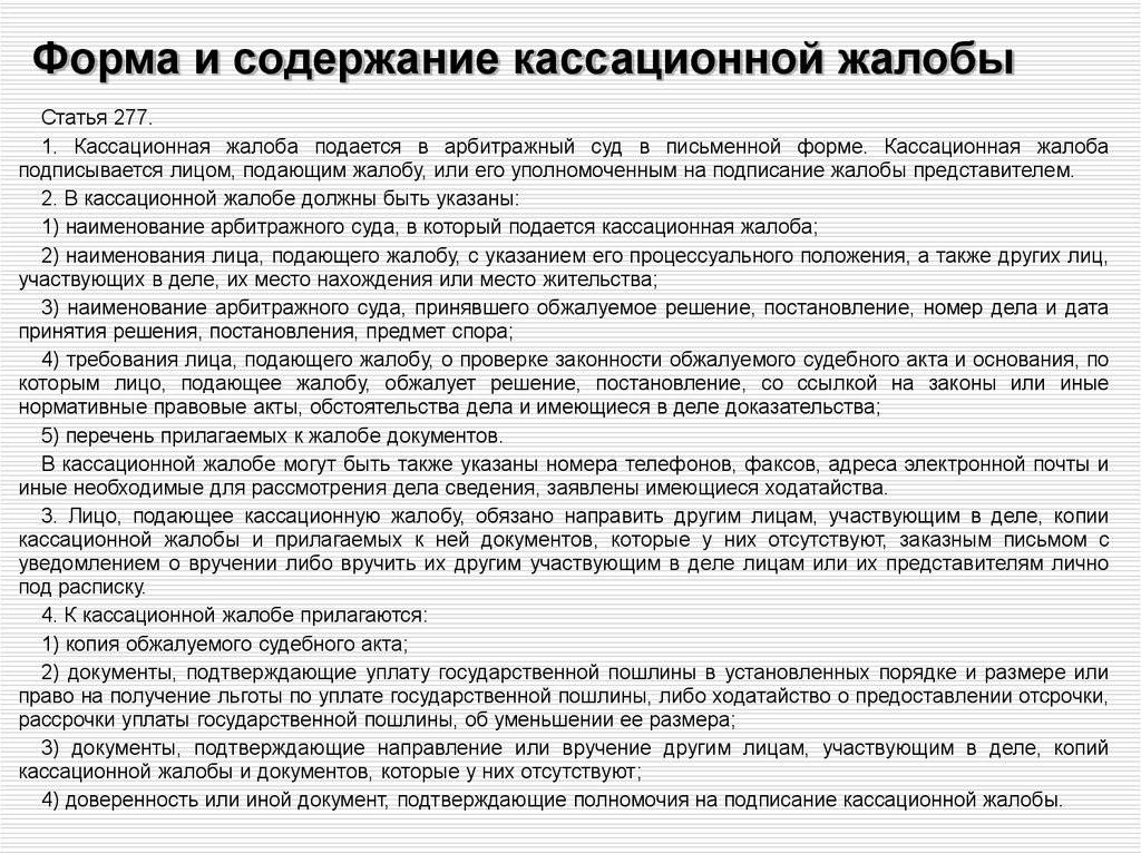 Статья 277 Форма и содержание кассационной жалобы
