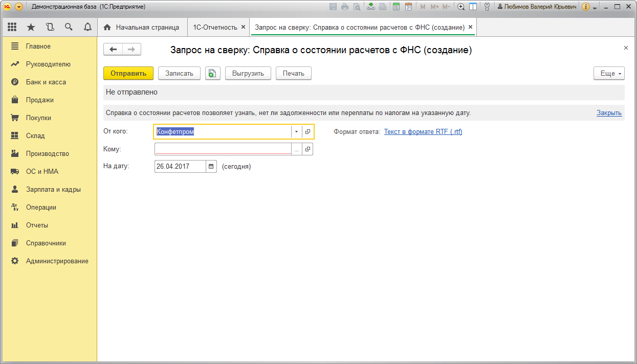 - Выберите команду “Справка о состоянии расчетов с ФНС”.