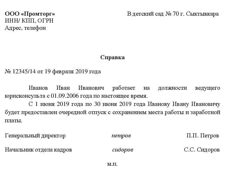 - Длительный отпуск (для сохранения места в ДДОУ за ребенком) — в этом случае нужно подтвердить факт работы в компании и указать период предоставления отпуска;