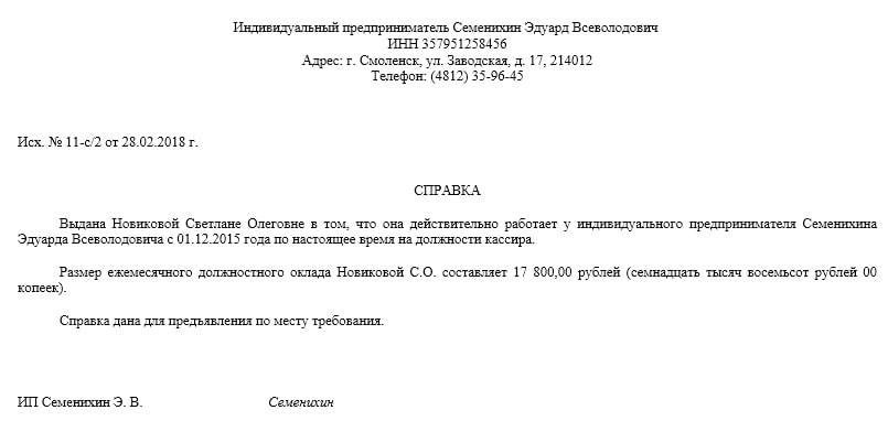Образцом для её составления для сотрудника ИП, в котором нет печати, будет обычный документ этого типа, в котором указываются реквизиты организации, её адрес, должность, сотрудника и т.п.