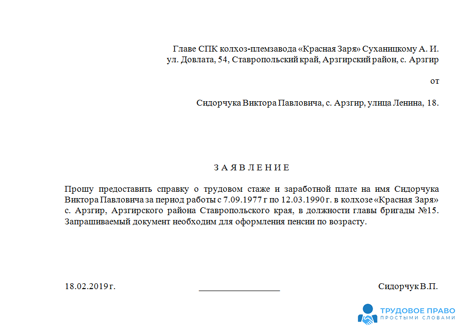 Лицу, продолжающему трудиться, справка о подтверждении стажа достанется проще всего. Достаточно обратиться с просьбой об этом к секретарю организации. Для написания заявления секретарь еще и подложит пример с места работы, чтобы было проще.
