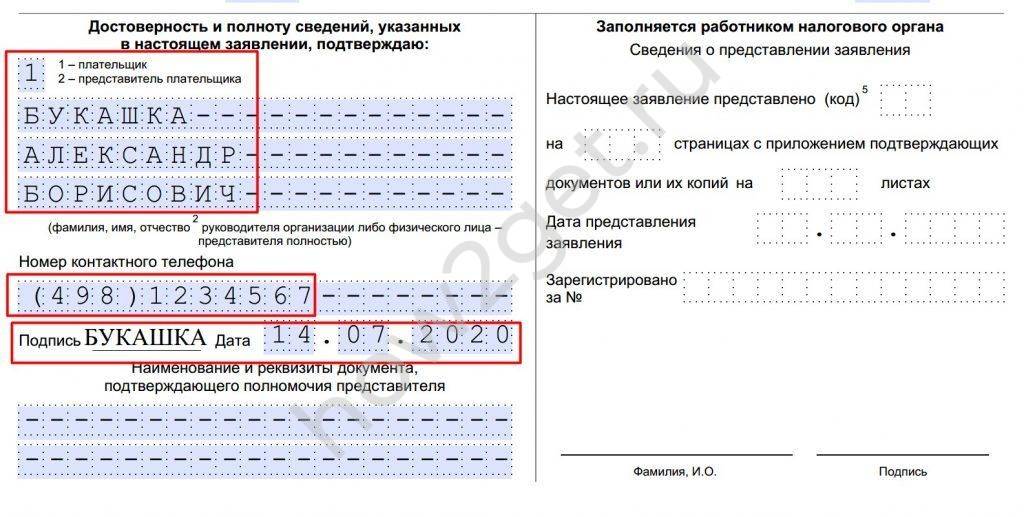 Далее страница разделена на две части. Заявитель заполняет только левую часть, правая же заполняется представителями налоговой инспекции, поэтому оставьте ее пустой.