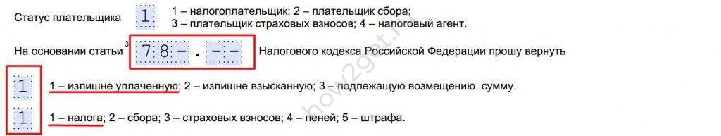 - Право возврата уплаченного налога у вас возникает на основании 78 «Статьи» НК, поэтому прописываем этот номер.