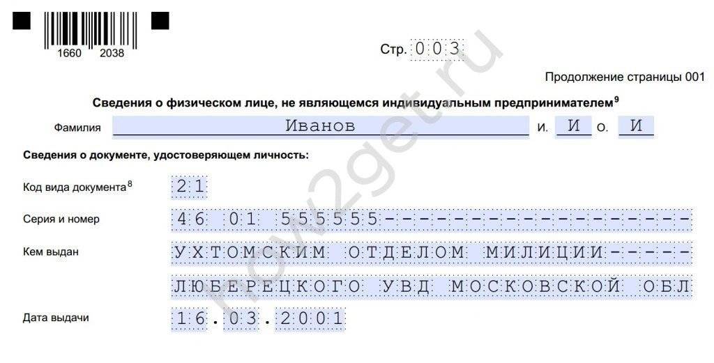 Снова указываем фамилию, имя и отчество. Затем регистрируем сведения о документе, подтверждающем личность. В нашем случае это паспорт гражданина РФ — код «21» (остальные коды в правилах заполнения, пункт 8). Указываем номер и серию, вписываем орган, выдавший паспорт, дату выдачи.