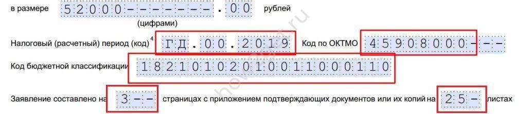 Вносим сумму к возмещению за покупку квартиры, в нашем случае это 52 000 рублей (сумма должна соответствовать сумме, заявленной в 3-НДФЛ). Регистрируем налоговый период, для НДФЛ — это год, вписываем «ГД.00.2019», затем указываем код ОКТМО, согласно утвержденным классификаторам. Указываем КБК — код бюджетной классификации. Для НДФЛ КБК всегда 182 1 01 02010 01 1000 110 (Приказ Минфина России от 85н от 06.06.2019; Приложение №3 к Приказу ФНС России от 29.12.2016 №ММВ-7-1/736@).